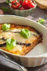 Baklažánové lasagne pečieme pri 180 °C približne 30 minút, kým syr získa zlatistú kôrku.
