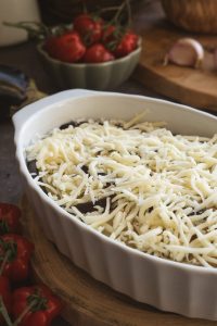 Opakujeme vrstvenie, kým spotrebujeme všetky suroviny, vrch zakončíme baklažánom a posypeme syrom.