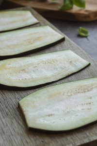 Baklažán nakrájame na tenké plátky, osolíme a necháme 15 minút odpočívať, aby pustil prebytočnú vodu a horkosť. Potom ho osušíme papierovým obrúskom.