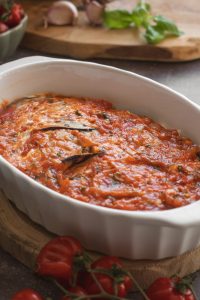 Pridáme paradajkovú omáčku a poukladáme na ňu baklažán.