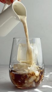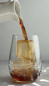 Do pohára pridáme ľad a prilejeme vychladnutú kávu.