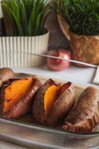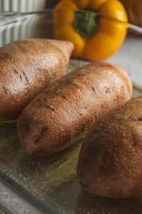 Batáty popicháme vidličkou, pokvapkáme olivovým olejom, osolíme a dáme piecť do rúry na 200℃ približne 1 hodinu.