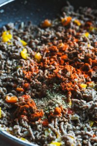 K mäsu prisypeme chilli, rascu, mletú červenú papriku, oregano, soľ a korenie. Premiešame a orestujeme ešte 5 minút, aby sa všetky chute prepojili.