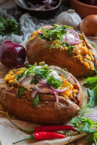 Plnené batáty podávame posypané červenou cibuľkou a dozdobené petržlenovou vňaťou.