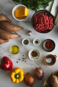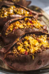 Upečené batáty pozdĺžne prerežeme a osolíme. Popicháme vidličkou, naplníme zmesou hovädzieho mäsa.