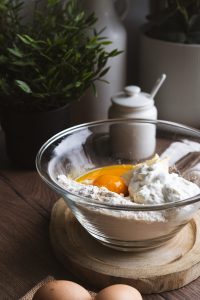 Múku pridáme do misky spolu s práškovým cukrom, kyslou smotanou, maslom, žĺtkami, rumom a štipkou soli.