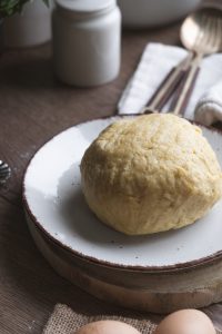 Vypracujeme cesto a necháme pol hodinu odpočívať pri izbovej teplote pod fóliou. Ak je príliš suché pridáme lyžicu kyslej smotany.