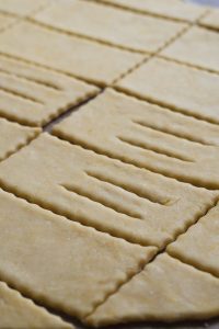 Cesto rozvaľkajte na tenký plát (3mm) a radieľkom alebo nožom nakrájame obdĺžniky. V strede každého obdĺžnika urobíme dva malé rezy.
