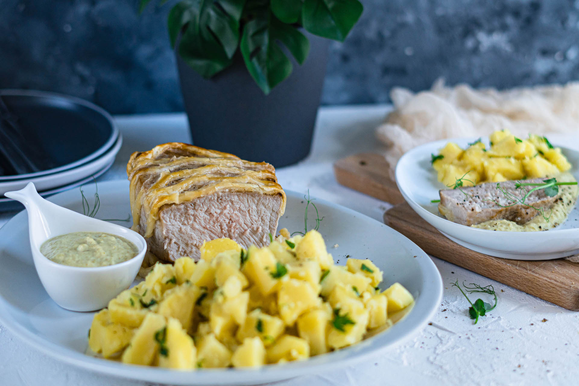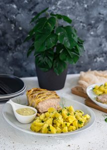 Bravčové karé podávame so zelerovo-špargľovou omáčkou a varenými zemiakmi s maslom a petržlenovou vňaťou.