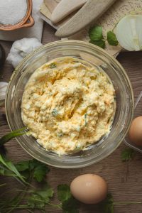 Bryndzu a maslo pridáme do misky a dobre premiešame dohladka, aby sa všetky ingrediencie spojili.