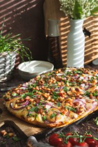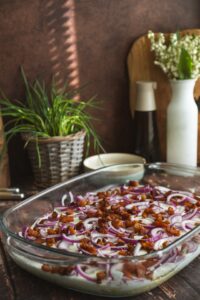 Vykysnuté cesto vložíme na vymastený pekáč a mokrými rukami ho poroztláčame až po okraj. Na cesto navrstvíme bryndzovú plnku a posypeme nakrájanou červenou cibuľou a opečenou slaninkou.