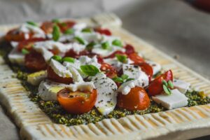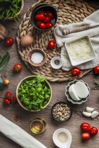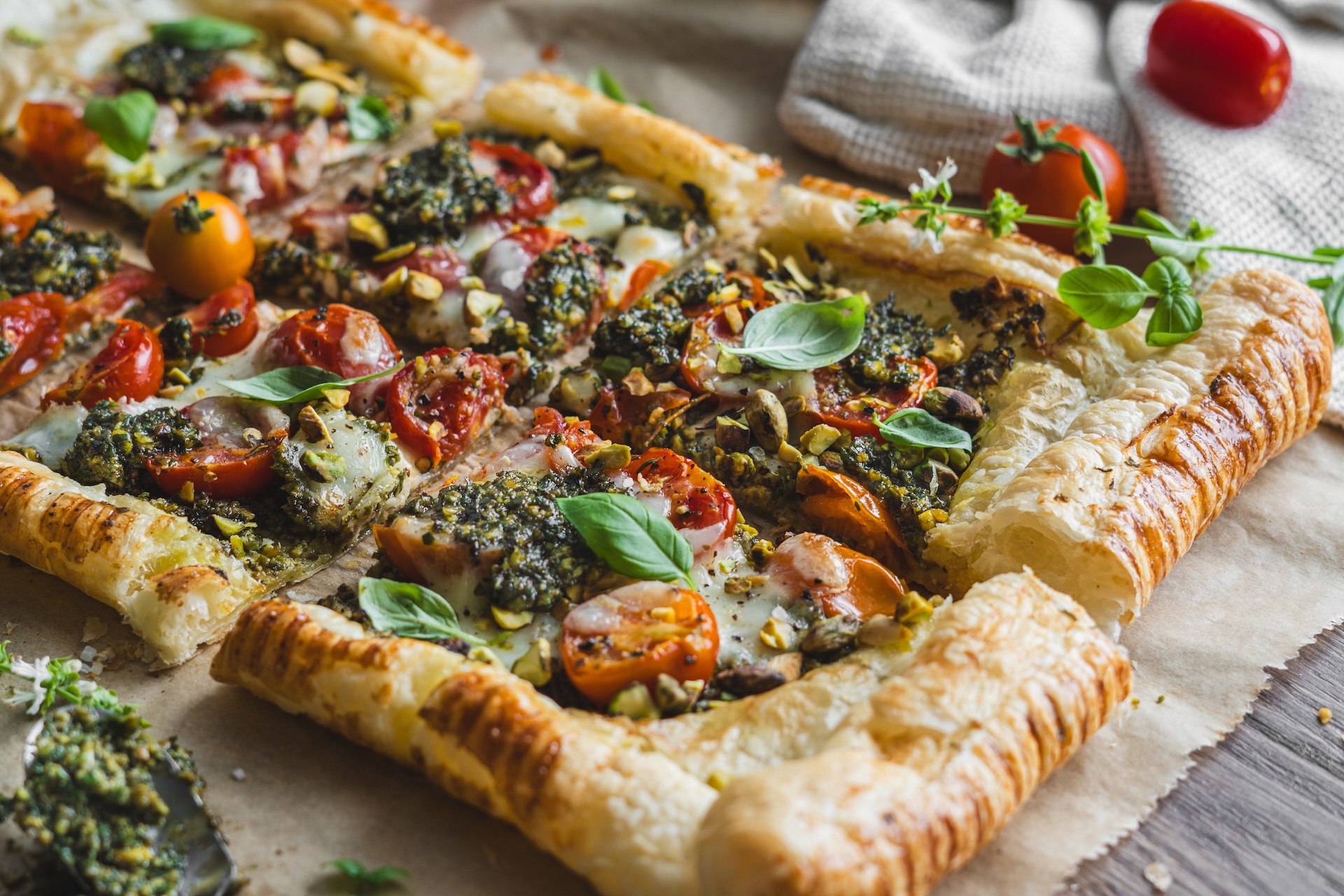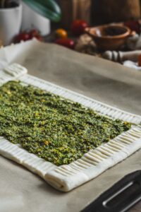 Lístkové cesto rozprestrieme na plech vystlaný papierom na pečenie. Okraje cesta zahneme a pritlačíme vidličkou. Stred potrieme bazalkovým pestom.
