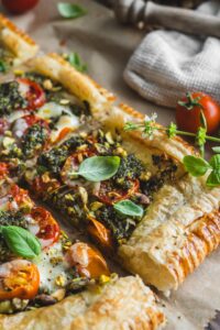 Necháme trochu vychladnúť, nakrájame a podávame so zvyšným pestom dozdobené opečenými pistáciami a čerstvou bazalkou.