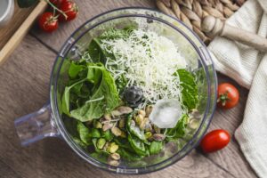 Do mixéra pridáme bazalku, cesnak, pistácie, nastrúhaný eidam, soľ, korenie a kocku ľadu. Rozmixujeme a prilejeme olivový olej. Premixujeme a pesto dochutíme soľou a korením.