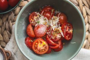 Paradajky nakrájame zmiešame s olivovým olejom, prelisovaným cesnakom, soľou, korením, trstinovým cukrom, nasekaným tymianom a chilli. Premiešame a odložíme bokom.