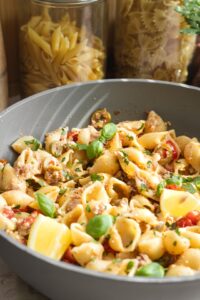 Do omáčky pridáme cestoviny a premiešame. Primiešame tuniaka a podávame dozdobené petržlenovou vňaťou, bazalkou a plátkom citróna.
