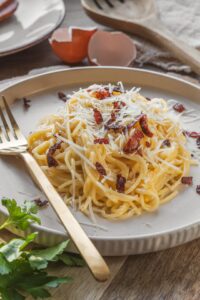 V miske zmiešame žĺtky, nastrúhané pecorino a čerstvo mleté čierne korenie. Pridáme 1–2 PL tuku zo slaniny a premiešame na hladkú, pastovitú zmes. Podľa potreby pridáme trochu vody z cestovín, aby vznikla jemná, krémová omáčka.