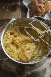 Cesto odstavíme a necháme približne 10 minút vychladnúť. Potom do mierne vychladnutého cesta zašľaháme po jednom vajcia, kým je cesto hladké, lesklé a kompaktné. Konzistenciou má pripomínať hustý krém – ak je príliš tuhé, môžeme pridať 1 PL horúcej vody.