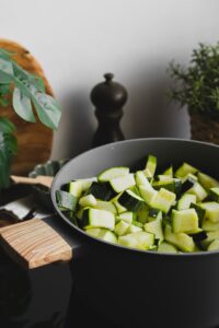 K cibuli pridáme nakrájanú cuketu, rascu, osolíme, okoreníme a zalejeme vývarom. Varíme asi 20-30 minút, kým cuketa nezmäkne.