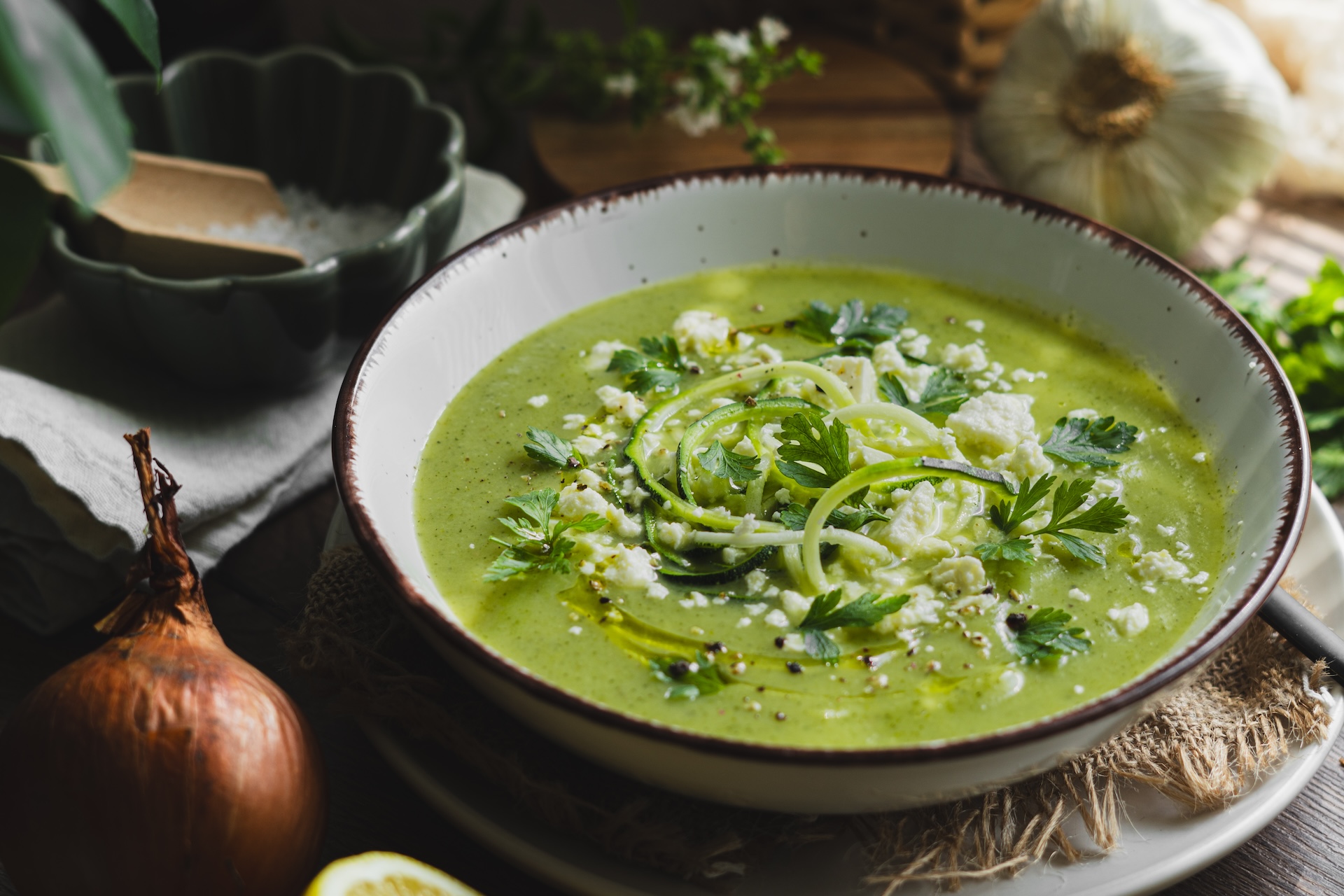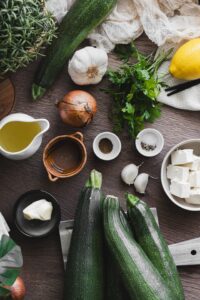 Podávame ju s feta syrom a cuketovými špagetami dozdobenú petržlenovou vňaťou a olivovým olejom.