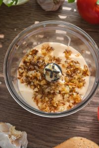 Cibuľu a cesnak nakrájame nadrobno a orestujeme na troške olivového oleja dozlatista. Necháme mierne vychladnúť a vložíme do mixéra.