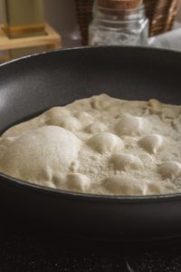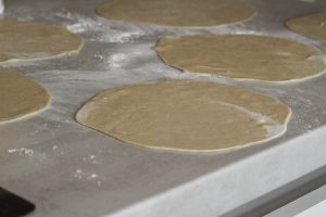 Tortilly pečieme na stredne rozohriatej suchej panvici 30–50 sekúnd z každej strany, kým sa neobjavia pľuzgieriky. Panvicu po každej tortille utierame od múky, aby sa nepripálila.