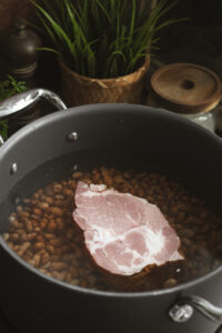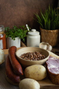 Fazuľu zalejeme vodou a necháme odstáť cez noc. Na druhý deň ju scedíme, vložíme do hrnca a zalejeme vodou. K fazuli pridáme údenú krkovičku a dáme variť na 1,5 hodiny. Môžeme pridať ak kožu zo slaniny.