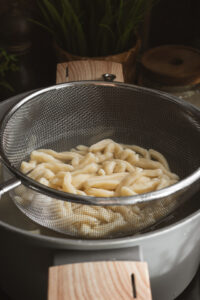 Na pracovnú dosku pridáme múku, soľ, vajce a premiešame pomocou lyžice. Postupne prilievame horúcu vodu a vypracujeme nelepivé a vláčne cesto. Cesto priklopíme miskou približne na 10 minút. Odstáte cesto rozdelíme na 2 časti a spracujeme bochníky, ktoré na pomúčenej doske rozvaľkáme a necháme postáť. Cesto pomúčime, nakrájame na pásy a naskladáme ich na seba. Následne nakrájame rezance, ktoré dáme uvariť do vriacej, osolenej vody. Keď vyplávajú na povrch, chvíľu ich povaríme. Rezance miešame, aby sa neprilepili na dno hrnca. Vytiahneme ich pomocou sitka a pridáme trochu oleja, aby sa nezlepili. Celý fotopostup nájdete na mojom blogu.