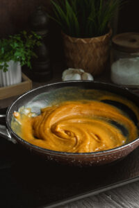 Pripravíme si zápražku. Rozohrejeme olej, do ktorého pridáme hladkú múku a osmažíme. Pridáme mletú červenú papriku, premiešame a zalejeme studenou vodou. Hotovú zápražku vlejeme do polievky a necháme prevrieť.