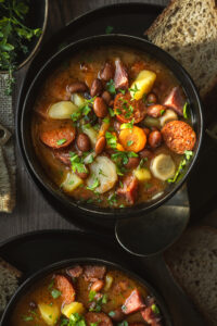 Do polievky pridáme nakrájanú klobásu, údené mäso, pridáme majorán a prelisovaný strúčik cesnaku. Dochutíme soľou a korením. Polievku podávame s domácimi rezancami a nasekanou petržlenovou vňaťou.