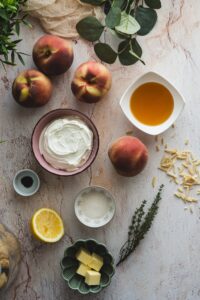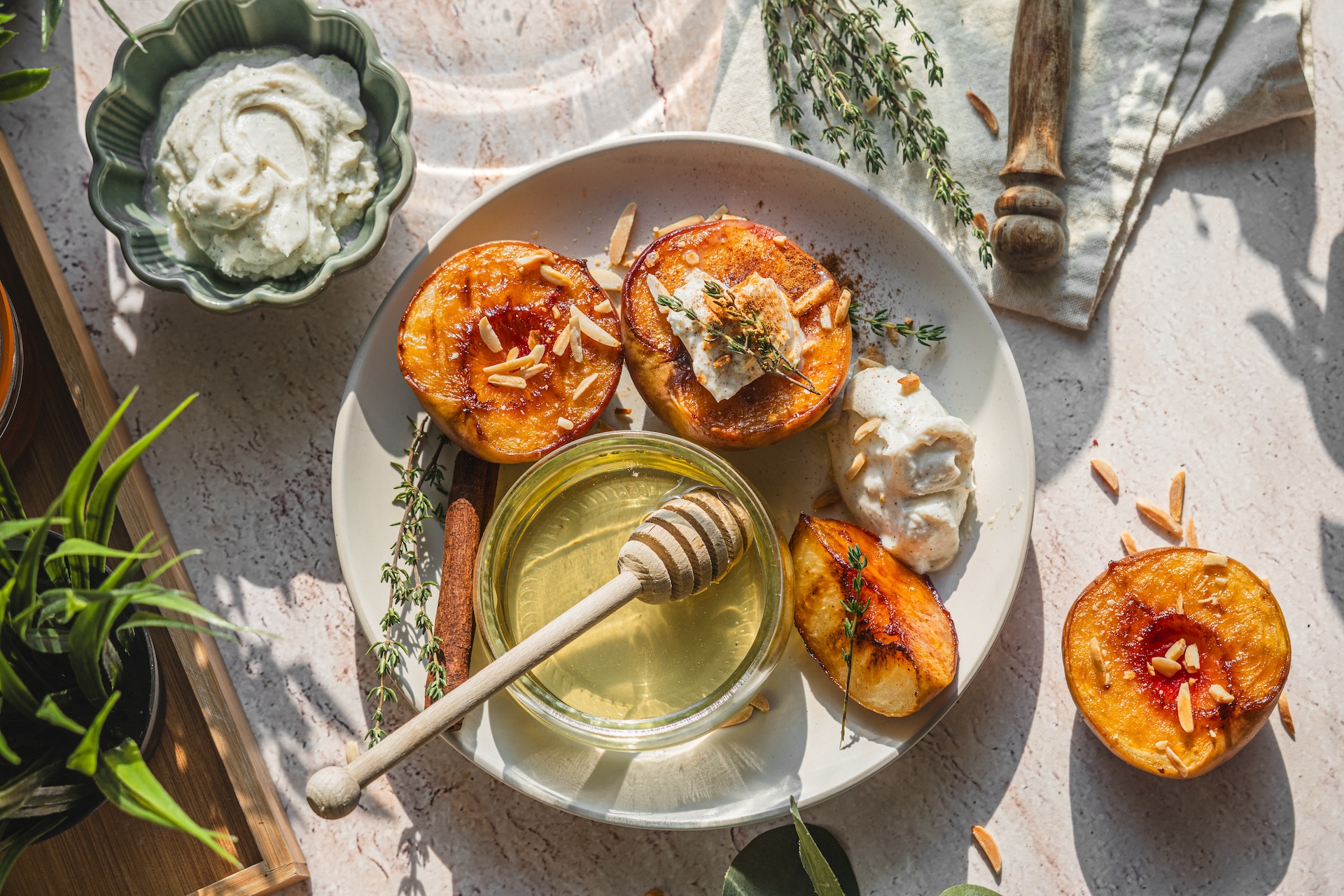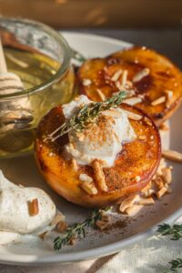 Broskyne podávame s vanilkovým mascarpone, opečenými mandľami dozdobené tymianom. Broskyne môžeme posypať aj škoricou.