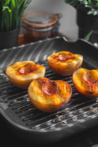 Na grilovacej panvici rozpustíme maslo a broskyne z každej strany opečieme dozlatista.
