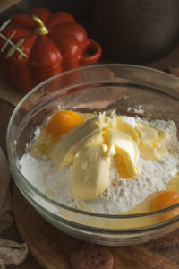 Do misky preosejeme múku, pridáme cukor, štipku soli, vanilkový cukor, prášok do pečiva, zmäknuté maslo, vajce a vypracujeme cesto.