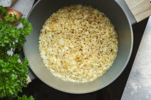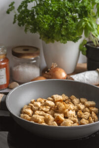 Chlieb zbavíme kôrky, nakrájame a opečieme na masti dochrumkava.