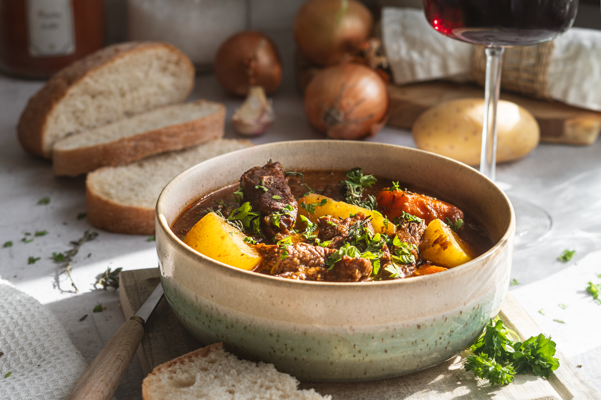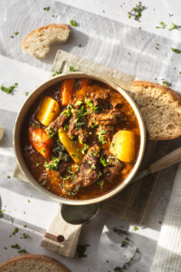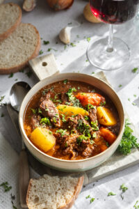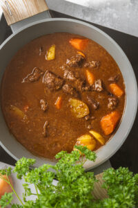 Do gulášu pridáme mrkvu nakrájanú na menšie kúsky a na štvrťky nakrájané zemiaky. Varíme ešte 40 minút, kým nebude zelenina mäkká a šťava sa nezredukuje.