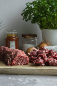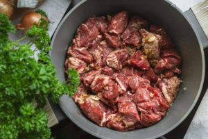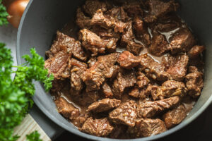 Potom k nej pridáme nakrájané hovädzie mäso a opečieme ho zo všetkých strán. Prisypeme mletú červenú papriku a tymian.
