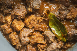 K hovädziemu mäsu pridáme pretlak, bobkový list, rascu, majorán, prelisovaný cesnak, chilli a opečený chlieb. Zalejeme vývarom po okraj mäsa a hrniec prikryjeme. Dusíme pod pokličkou asi 1,5 hodiny.