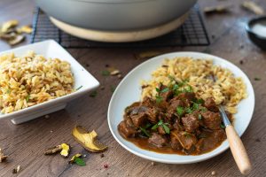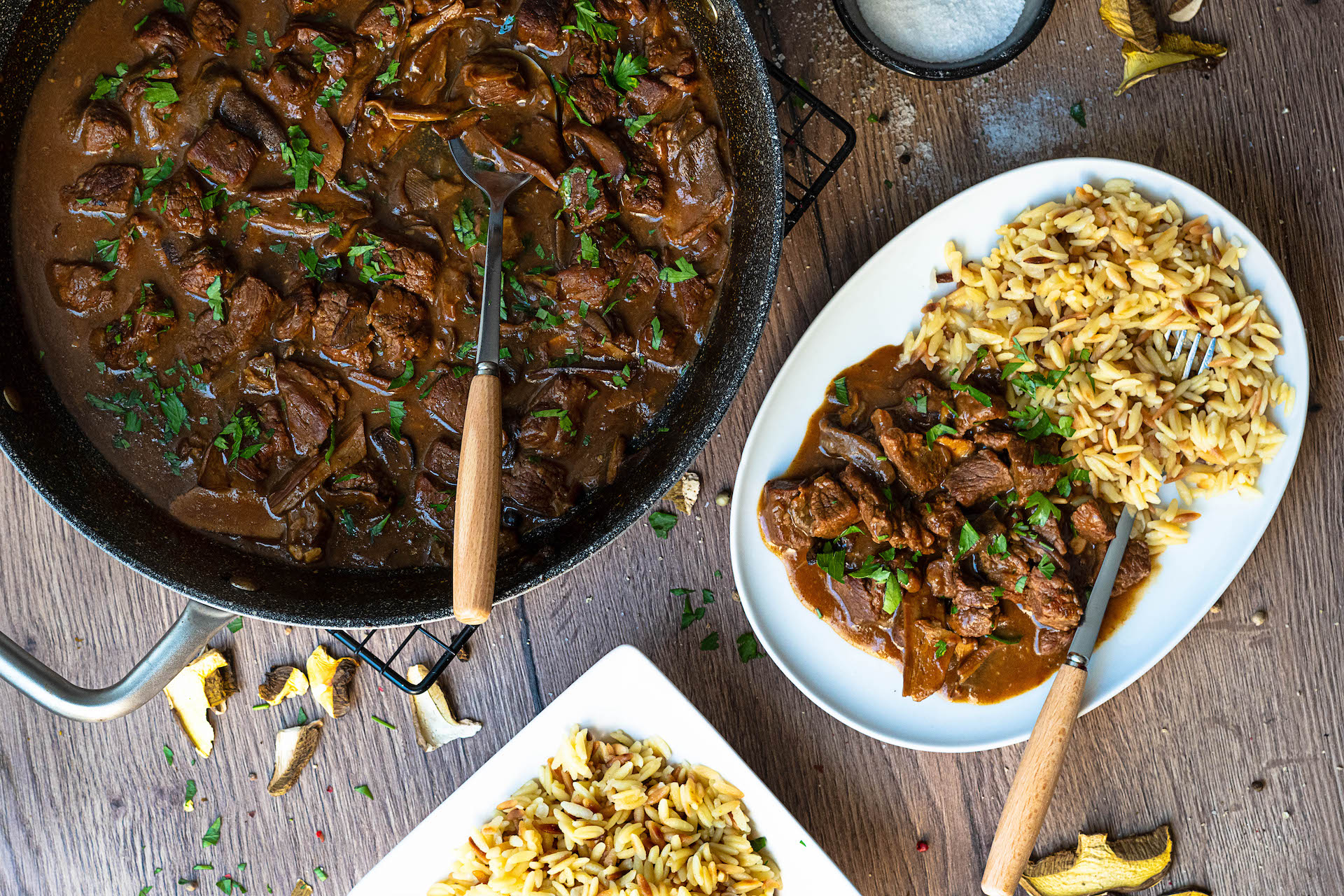 Hovädzie mäso podávame so slovenskou ryžou posypané nasekanou petržlenovou vňaťou.