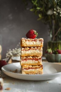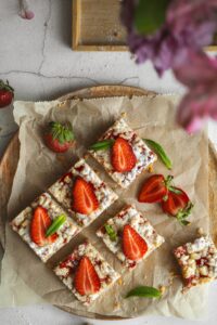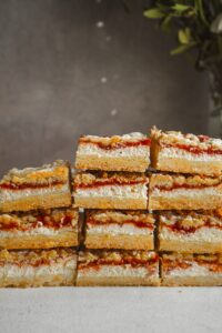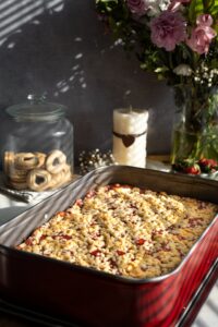 Na tvarohovú plnku pridáme jahodovo-rebarborovú zmes a posypeme nastrúhaným cestom.