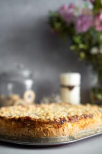 Hladkú múku preosejeme do misky spolu s práškom do pečiva, pridáme práškový cukor, žĺtok, zmäknuté maslo a štipku soli. Vypracujeme cesto, ktoré rozdelíme na dve časti. Väčšiu časť použijeme na spodné cesto a menšiu časť nastrúhame na vrch koláča. Zabalíme do fólie a necháme odpočívať v chladničke 1 hodinu.