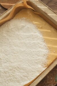 V miske zmiešame kokos, práškový cukor a vanilkový cukor. Túto posýpku rovnomerne nasypeme na surové cesto.