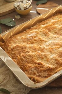 Cesto vylejeme na plech vystlaný papierom na pečenie. Ja som použila rozmer 32 × 23 cm, vďaka čomu bol koláč krásne vysoký. Ak preferujete nižšie cesto, pokojne použite klasický veľký plech.