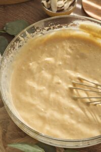 Vajcia vyšľaháme s kryštálovým cukrom do svetlej peny (asi 3 minúty). Prilejeme mlieko, olej a krátko premiešame. Nakoniec vmiešame polohrubú a hladkú múku zmiešanú s práškom do pečiva a štipkou soli.