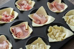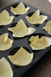 Lístkové cesto nakrájame na štvorce a vložíme ich do vymastenej formy na muffiny, aby trošku pretŕčali.
