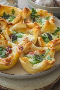 Štvorčeky popicháme vidličkou a môžeme si vytvoriť 3 druhy košíčkov:slanina - krémový syr - mozzarellašunka - krémový syr - mozzarella feta - bazalkové pesto - sušené paradajky - mozzarella Hotové košíčky potrieme rozšľahaným vajíčkom a pečieme pri 180 °C asi 15–20 minút, kým budú nafúknuté a zlatisté.