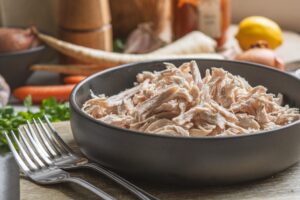Kuracie mäso natrháme alebo nakrájame na menšie kúsky a pridáme späť do polievky. Na záver dochutíme citrónovou šťavou podľa chuti.