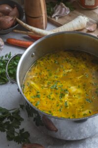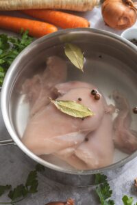Kuracie prsia vložíme do hrnca so studenou vodou, pridáme bobkový list, celé korenie a trochu soli. Privedieme do varu, počas varenia zbierame penu, stiahneme plameň a varíme 15–20 minút. Mäso vyberieme a odložíme bokom, vývar precedíme.