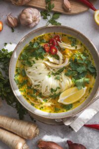 Polievku podávame s ryžovými rezancami, posypanú čerstvou petržlenovou vňaťou, doplnenú plátkom citróna. Na dochutenie sa hodia aj tenké plátky čerstvého chilli.