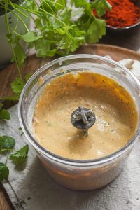 Do misky pridáme vajíčka, cottage syr, mlieko, soľ, korenie, prelisovaný cesnak, múku, mletú červenú papriku a nasekanú petržlenovú vňať. Všetko spolu premixujeme do hladkého, hustejšieho palacinkového cesta.