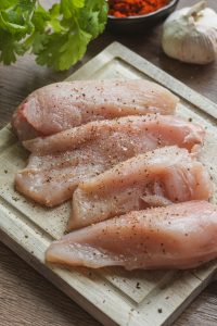 Kuracie prsia nakrájame na menšie rezníky. Osolíme ich, okoreníme a obalíme z každej strany v hladkej múke. (Vďaka tomu bude cesto lepšie držať)